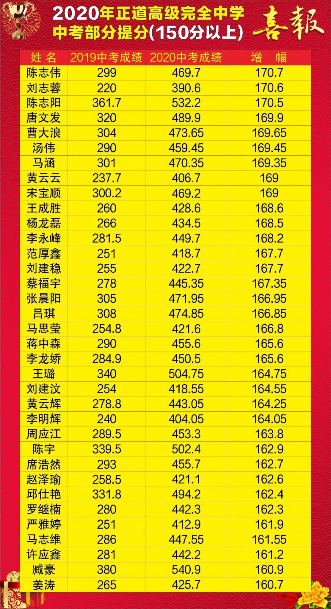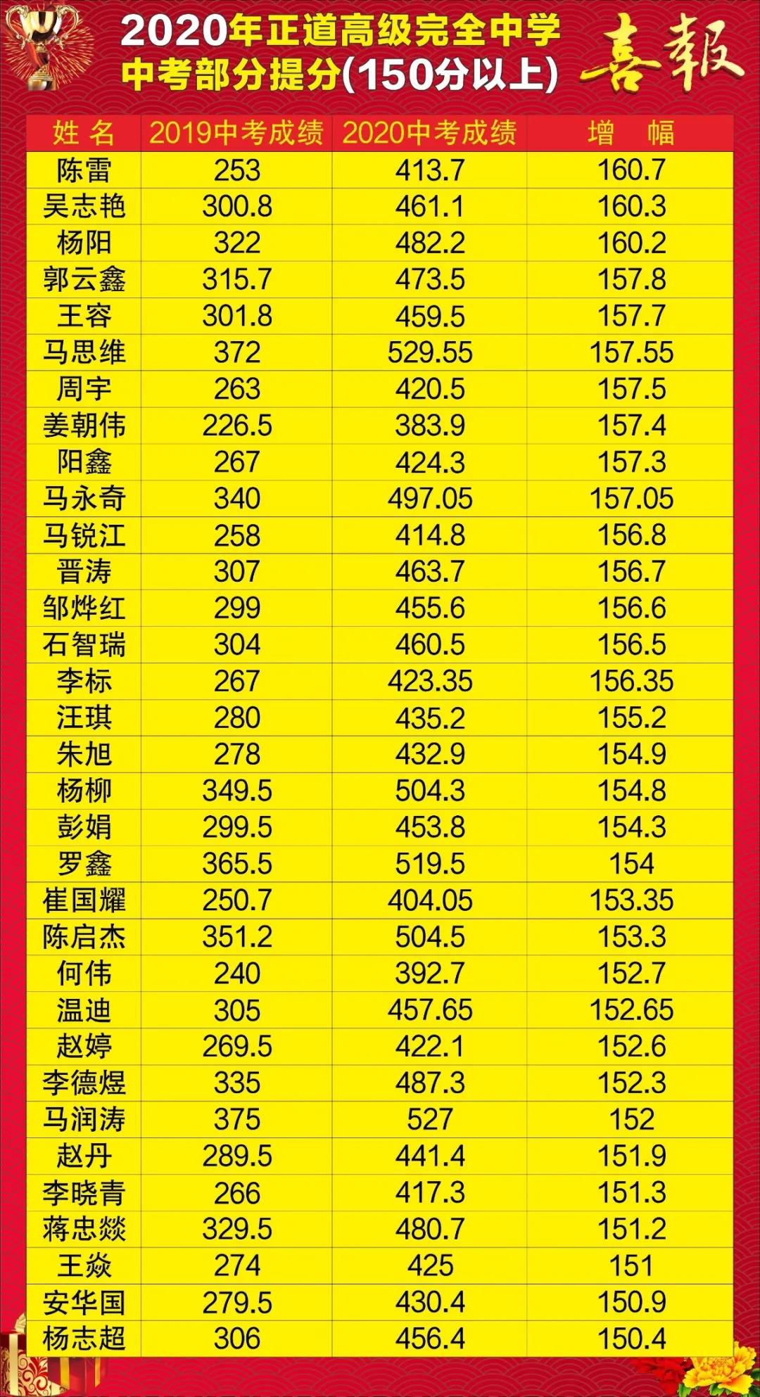 正道初中部全体师生凝心聚力,拼博奋斗,奋起直追,努力前行,实现了低进高出质的飞跃。2020年中考最高分初三7班张宇航同学569分,500分以上124人,520分以上55人。