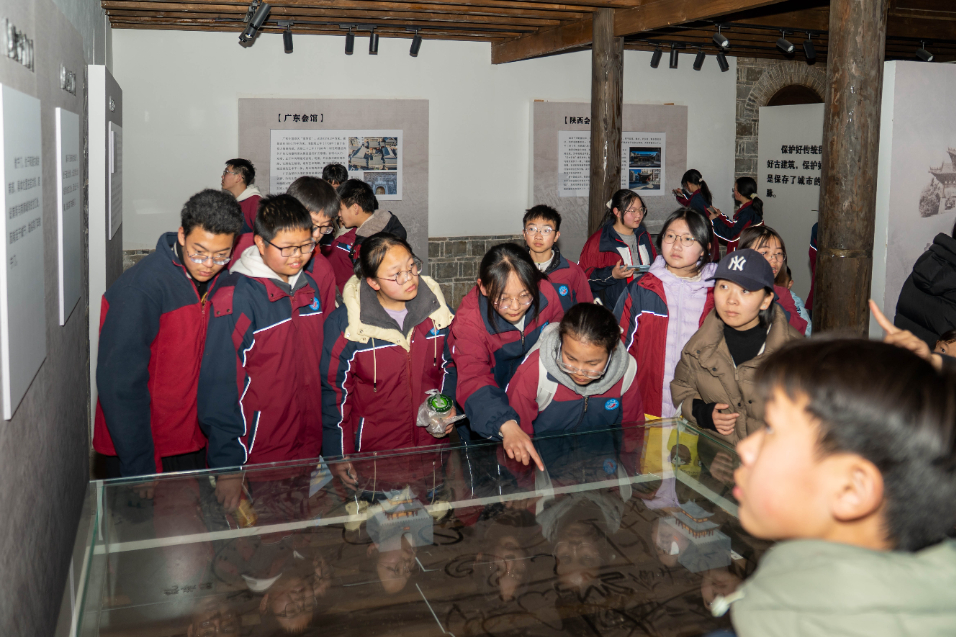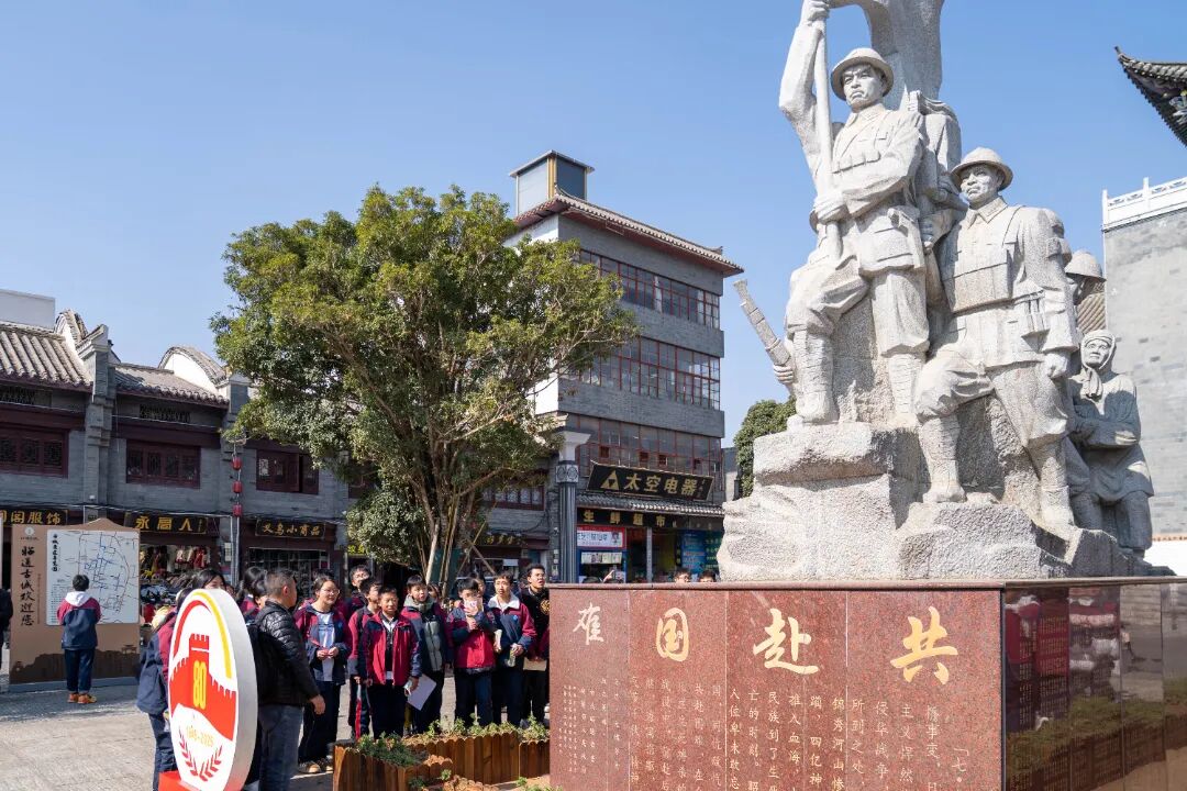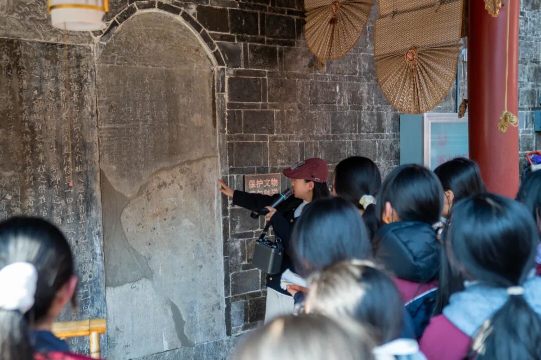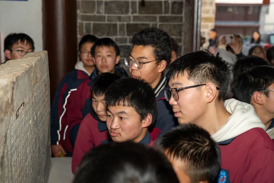 沿着青石板路,师生们来到镇署周边,追寻国学大师姜亮夫先生的教育足迹。在先生曾经讲学的地方,同学们轻读其生平故事,感受烽火岁月中知识分子“教育救国”的坚定信念。矗立在“共赴国难”雕像前,石刻上抗战时期昭通文人志士的爱国故事,让少年的心灵深受震撼。在铜雕地图前,大家俯身细辨每条街巷的历史渊源,完成了一次跨越时空的“古城解码”。