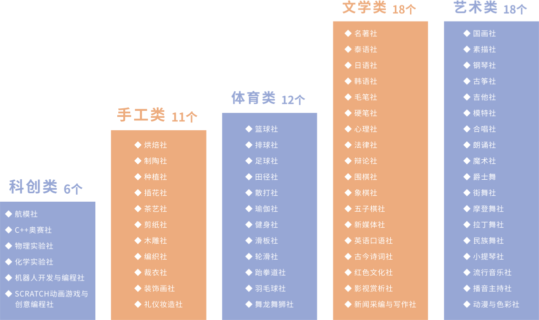 社团是校园文化的活力源泉,更是志同道合者奔赴热爱的聚集地。我校拥有百余个社团,其中科创、手工、体育、文学、艺术五大类别65个代表性社团,精准锚定学子多元兴趣与特长,全方位覆盖不同成长需求。从手工创作到前沿科技,从静态创作到动感竞技,这里总有一方天地能承载你的热爱。