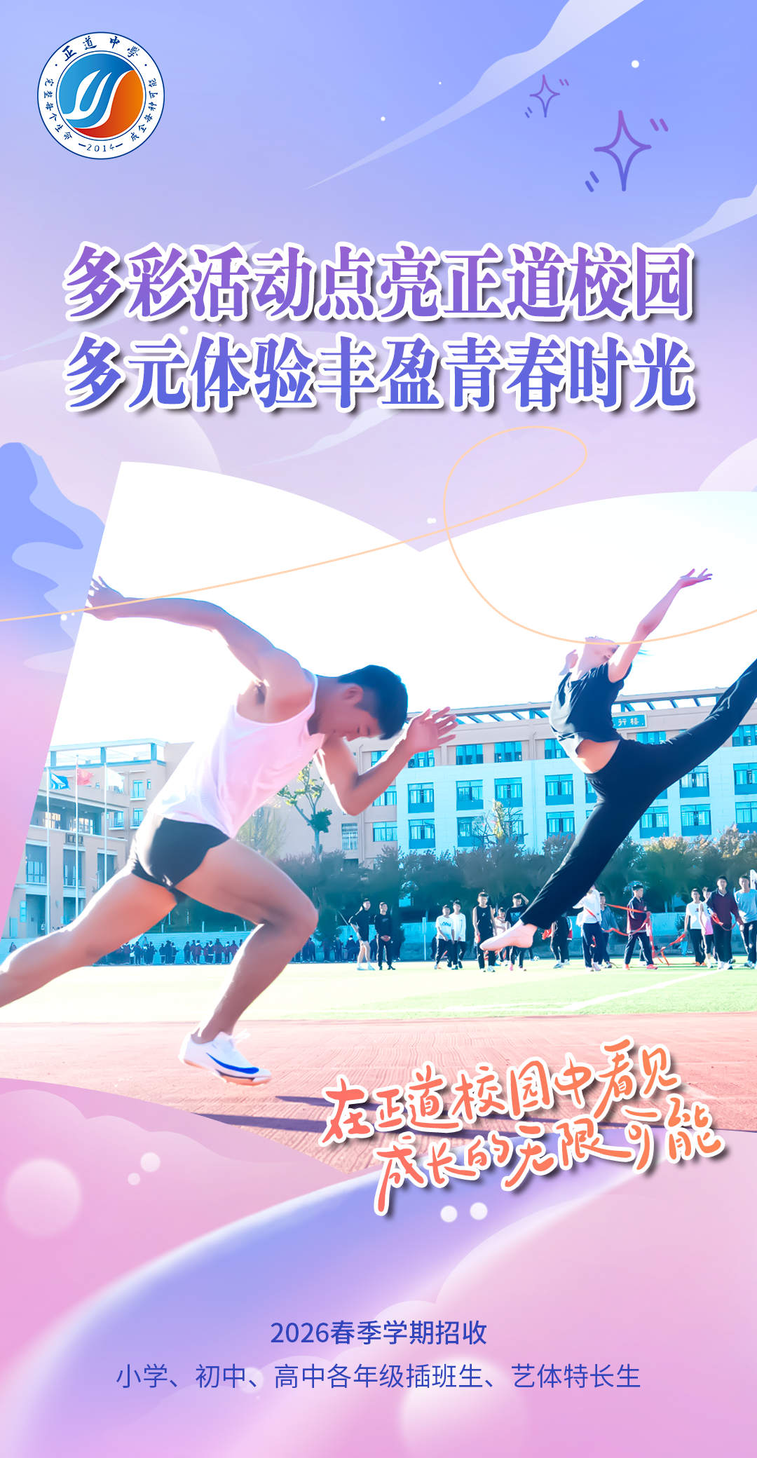 在正道中学,每一次挑战都是超越自我的契机!我们为你搭建挥洒热血的赛场,期待看到你在赛场上全力以赴的模样,用拼搏书写属于自己的青春荣光。