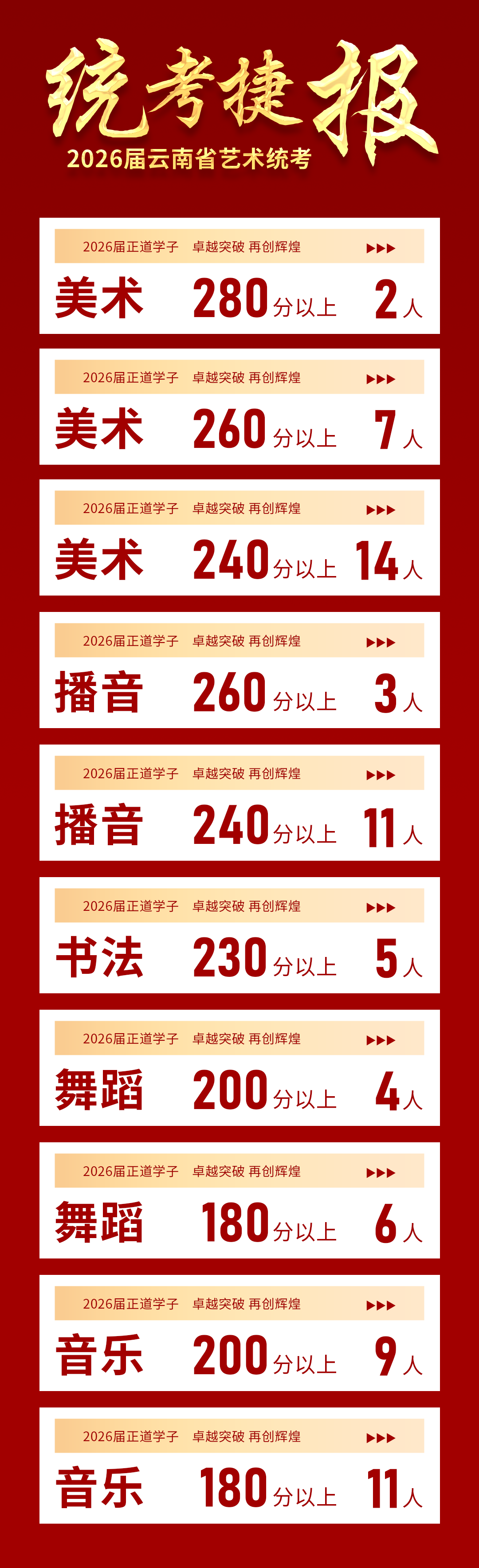 正道中学艺术中心开设了音乐、美术、播音、舞蹈、书法特色专业,全方位覆盖多元艺术兴趣,适配不同学子的天赋与追求。如果你心怀艺术热爱,渴望系统的艺术教育,那就抓住本次插班机会,加入我们!我们将以专业的教学、优质的环境、贴心的服务,助力你走出属于自己的艺术成才之路。