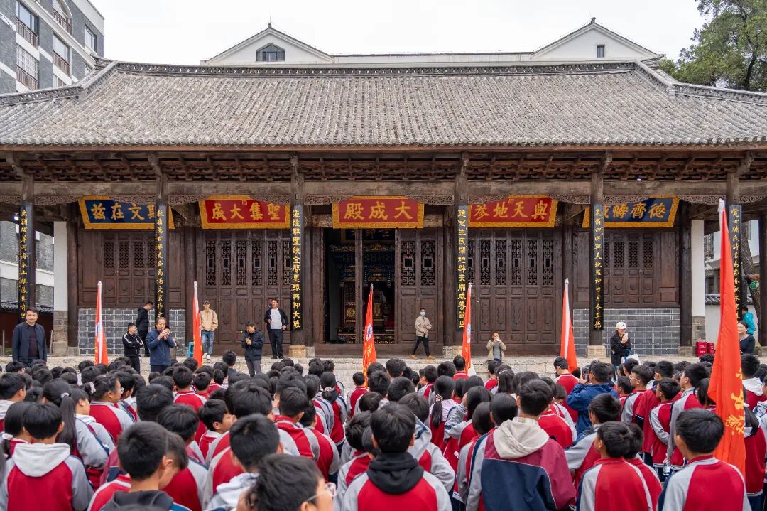 清晨的凤池书院,古木苍翠,翰墨飘香。学子们身着整齐校服,踏上风雨斑驳的状元桥,仰望沧桑巍然的汉孟孝琚碑,感受昭通文脉的重量。肃立于文庙大成殿前,大家凝神聆听,随讲解穿越时光——这座建于清雍正年间的官式建筑,曾祭祀孔子、传习儒风。大成殿内每一处构件、每一幅纹饰,都深深镌刻着古人对圣贤的敬仰。