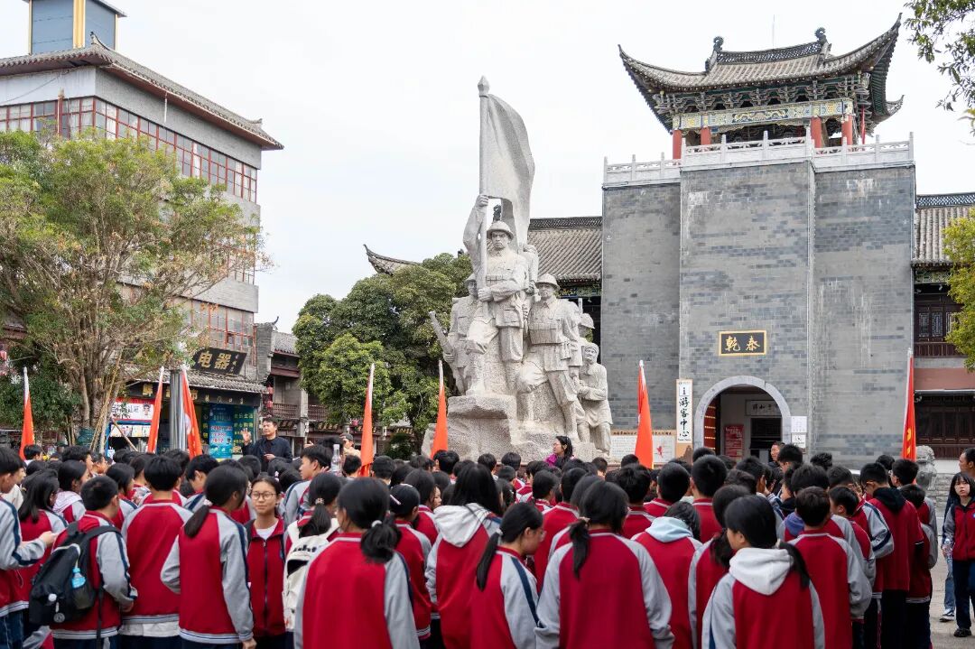 告别文庙,学子们沿文渊街、怀远街前行。青石板路被岁月磨得温润发亮,两侧古民居错落有致,飞檐翘角间藏着昭通的烟火与诗意。行至辕门口,同学们再次列队,聆听古城街巷的故事——这里是古城的核心枢纽,连接着云兴街的市井烟火、陡街的错落肌理,更传颂着万千将士共赴国难的壮烈传奇。
